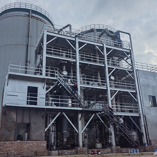 流動過程中,氯化鈣液體被(bèi)殼程蒸汽加熱汽化(huà),蒸汽與液相共同進入蒸發器的分離室(shì),汽液經充分分離,一效(xiào)分離(lí)器出來的二次蒸汽,除供熱泵混合(hé)外,進(jìn)入二效降膜蒸發器(qì),二效分離(lí)器出來的二次蒸汽全部進入(rù)三效強製循環蒸發器。